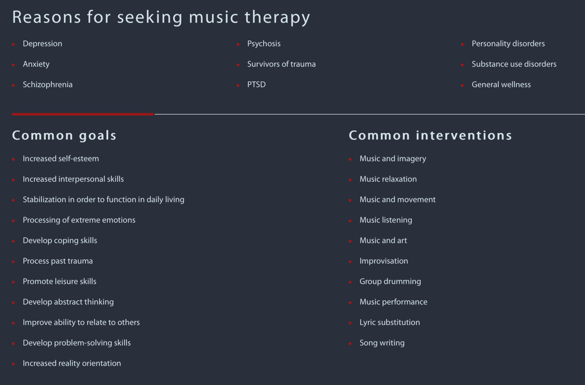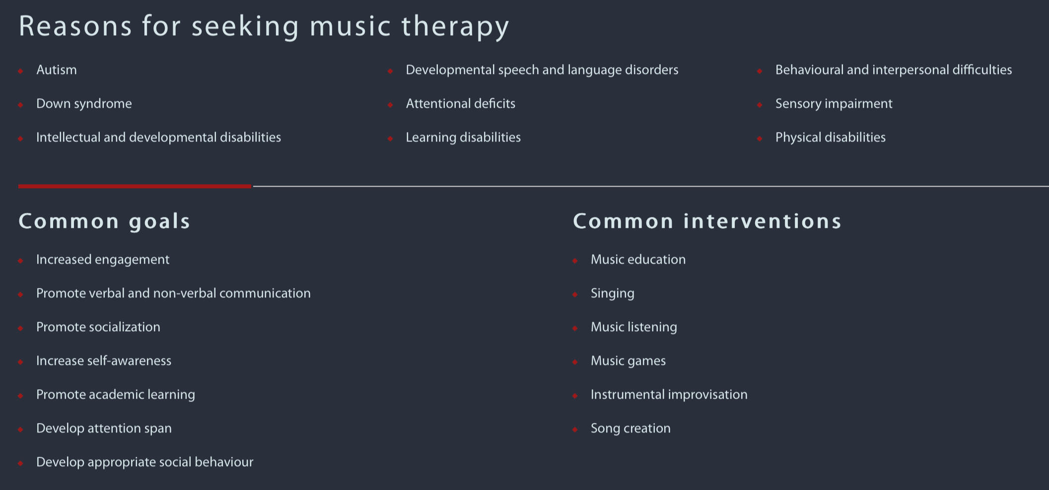 “Music therapy is a discipline in which credentialed professionals (Music Therapist Accredited) use music purposefully within therapeutic relationships to support development, health, and well-being. Music therapists use music safely and ethically to address human needs within cognitive, communicative, emotional, musical, physical, social, and spiritual domains.”
